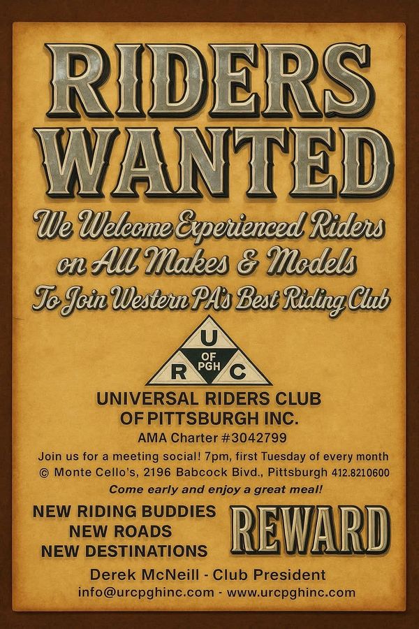 Founded in 2014, Universal Riders Club of Pittsburgh Inc. started as a small motorcycle riding club with the goal of being a riding club for all riders and their varied bikes and trikes. Over the years, we have grown into a club known for riding every weekend from April through October and welcoming all riders. We boast a membership of over 100 members. Come and see why the URC is a great group of people to be with.